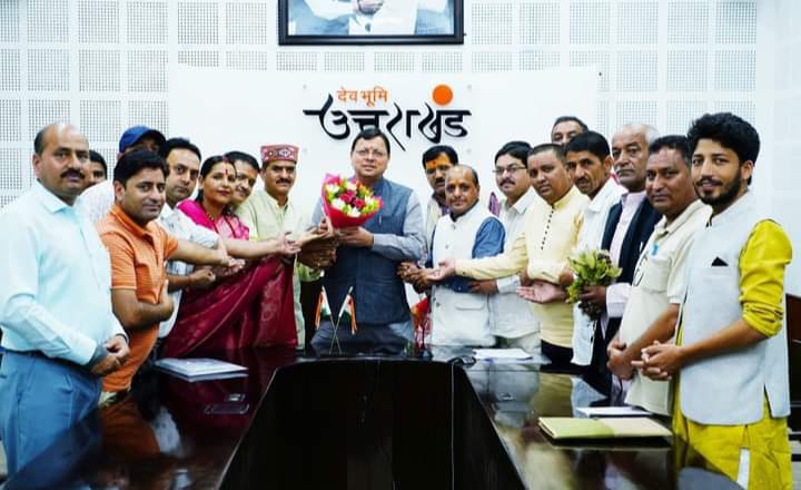 CM धामी से मुख्यमंत्री आवास में भाजपा के प्रदेश मीडिया प्रभारी मनवीर सिंह चौहान के नेतृत्व में आए लोगों ने मुलाक़ात की